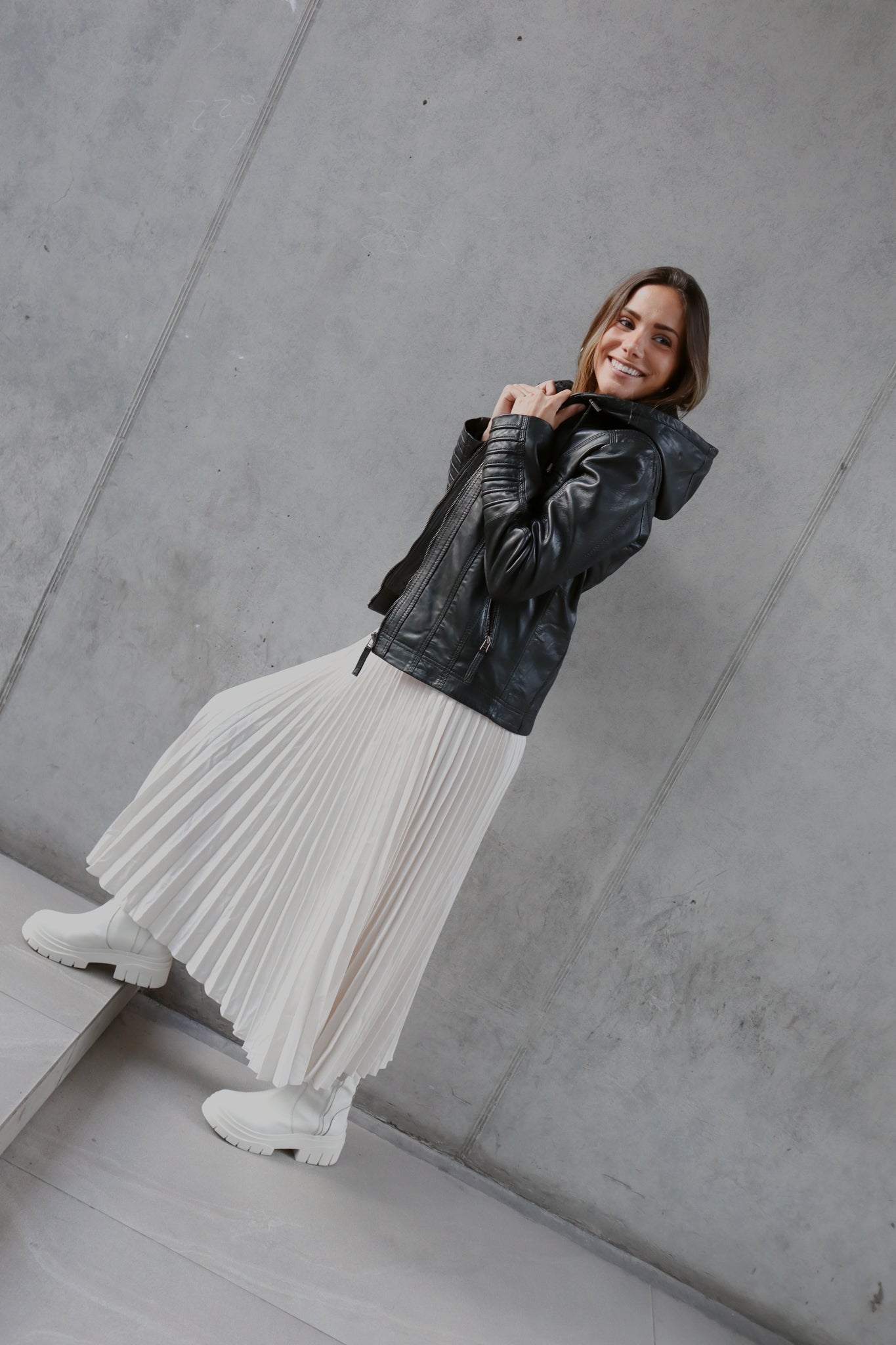 La capucha en cuero desmontable permite transformar el look según la ocasión.