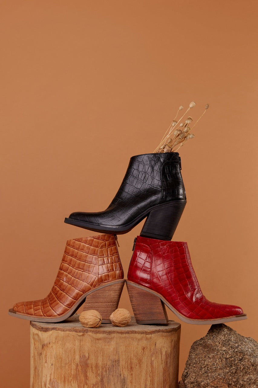 Un botín moderno y versátil, confeccionado en 100% cuero vacuno, que combina elegancia y comodidad. Su cierre trasero facilita el calce y asegura un ajuste perfecto, mientras que el taco de 9 cm estiliza la figura y aporta altura sin perder confort.