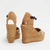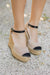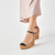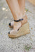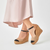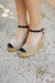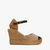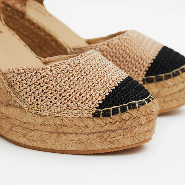 Su cuña de yute natural teñido al tono (10.5 cm atrás / 3 cm adelante) y la horma redonda estilizan la silueta sin renunciar al confort.