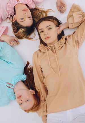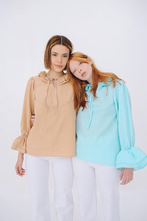 BLUSA CON VOLADOS DE CREP DE POLIESTER CON ARRUGA Y SPANDEX.