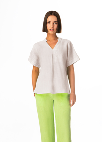 Elegancia natural y frescura atemporal. Esta blusa de lino de manga corta, con delicado pliegue frontal y favorecedor cuello en V, combina comodidad y sofisticación en una sola prenda. Su textura ligera y transpirable la convierte en el aliado perfecto para cualquier temporada.