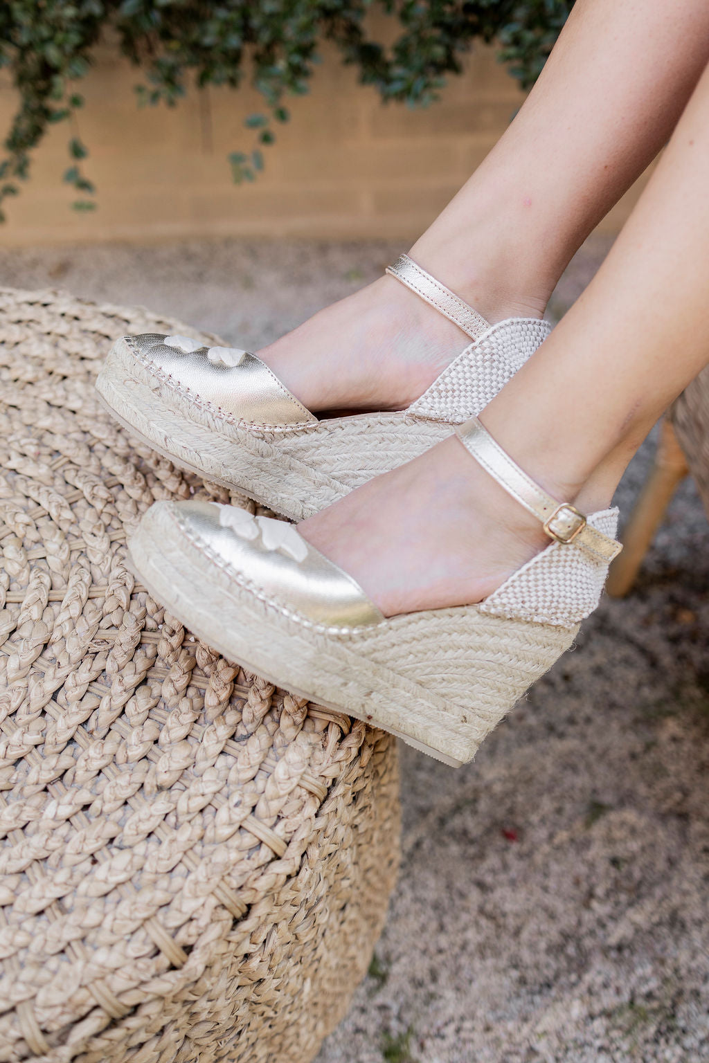 Elegancia y tradición se unen en esta alpargata de cuña de yute natural cosida a mano, con horma redonda y un acabado que realza cualquier look.