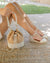 Cuerpo de rafia natural tejida y una base estructurada de cuero italiano.