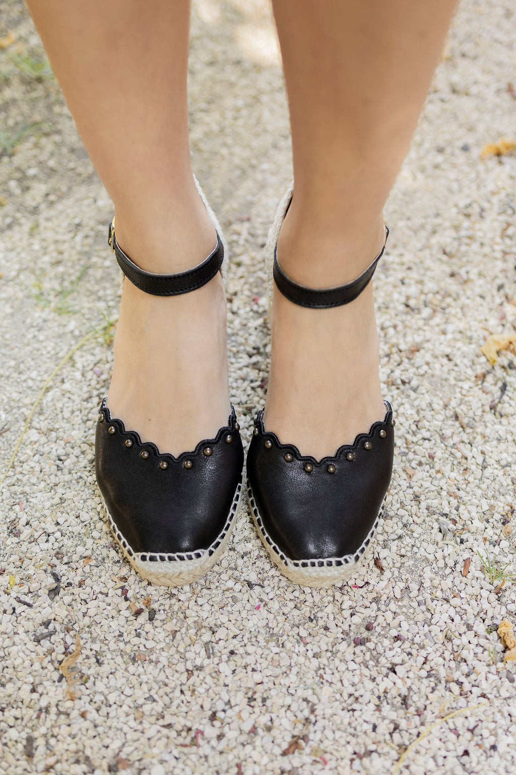 Alpargata española en cuero italiano con diseño de ondas y tachas.