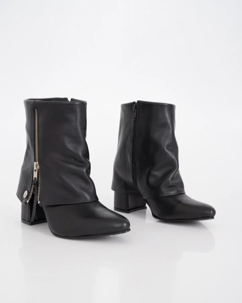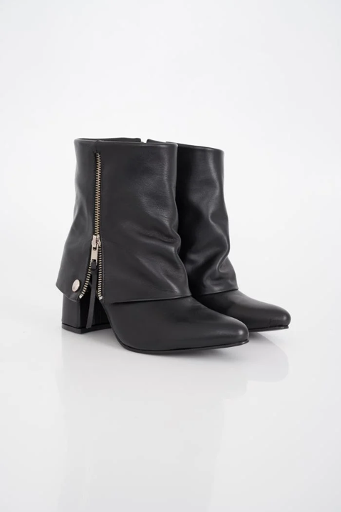 Bota con caña volcada confeccionada en cuero natural. Detalle de cierre níquel externo y aplique de corazón, cierre interno.