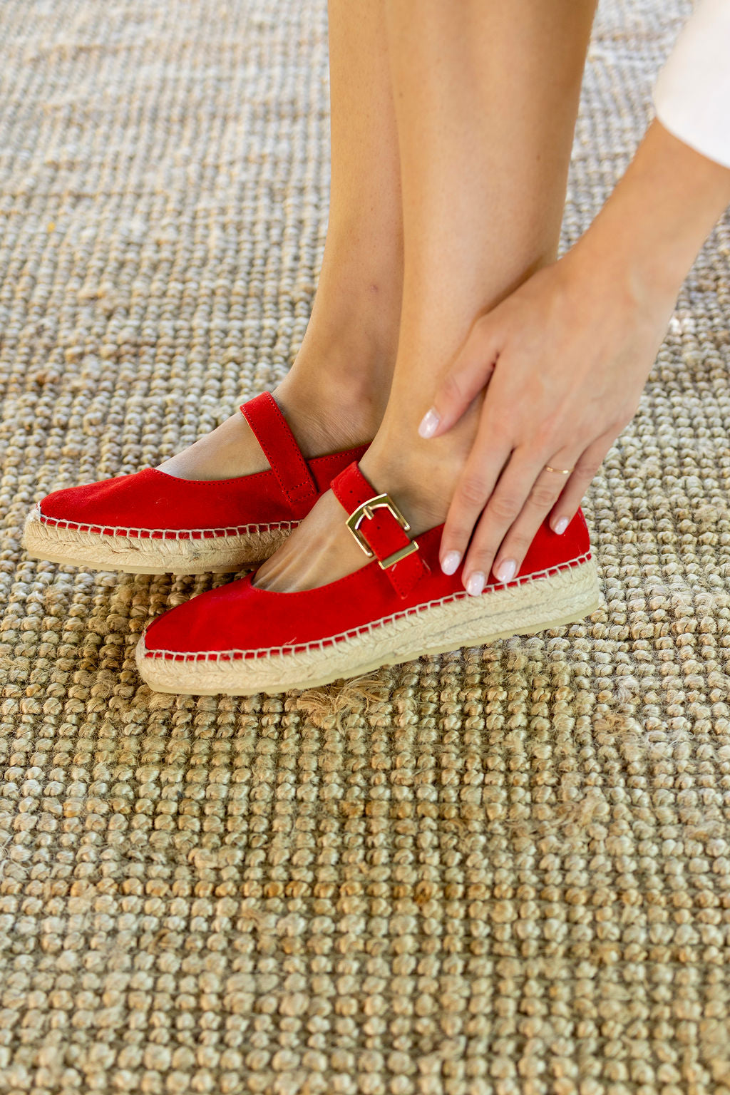 Alpargata estilo bailarina en gamuza, con pulsera ajustable con hebilla y punta redondeada que aporta un toque femenino y versátil.