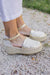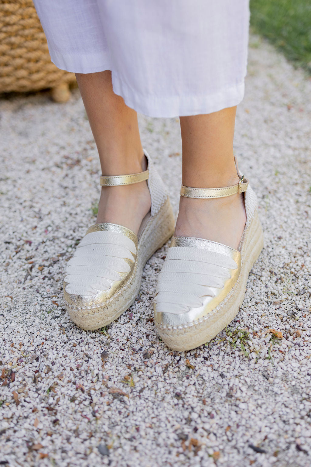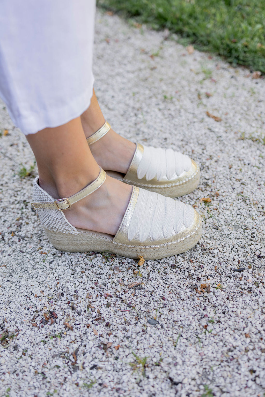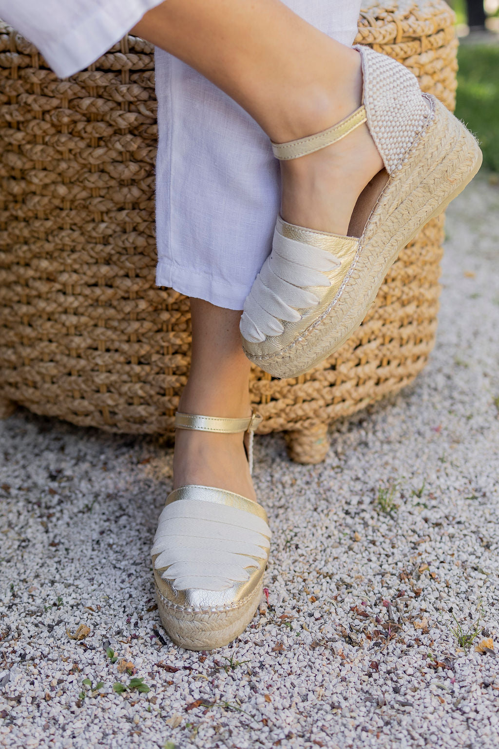Confeccionada en cuero con pasadas y cosida a mano de forma artesanal, esta alpargata presenta una cuña de yute natural con horma redonda que estiliza sin perder naturalidad.