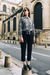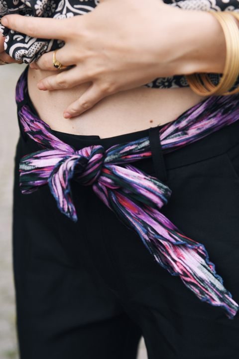 Pantalón fluido de cintura alta. Patas anchas apretadas en la parte inferior. Bolsillos laterales y bolsillos ribeteados en la parte trasera. Cintura elástica con cierre de cremallera y botón frontal. Cinturón desmontable.