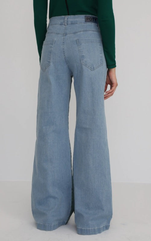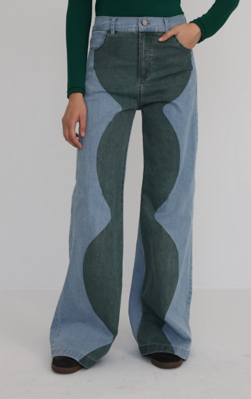 Pata Ancha Trama, confeccionado en denim elastizado. Estampa fija en el frente inspirada en la obra de la artista Antonia Guzmán. Es nuestro clásico pantalón de pata ancha, presente en todas las temporadas. Se destaca por su tiro medio y bolsillos traseros ligeramente amplios, justo como nos gusta! Diseñado para adaptarse a todos los tipos de cuerpo, esta prenda básica ofrece comodidad y mucha onda.