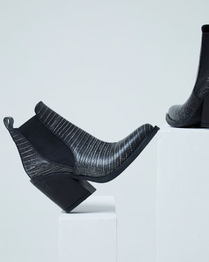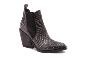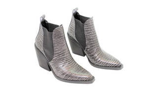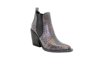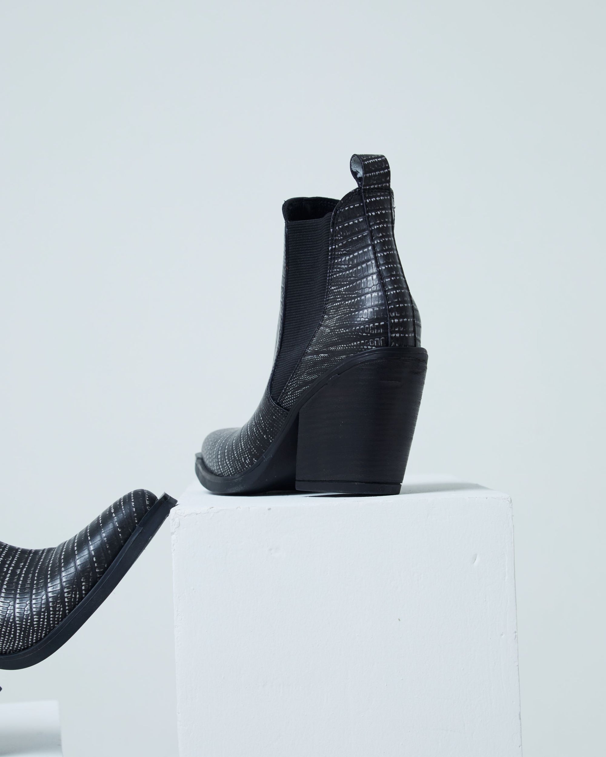 Un botín que combina modernidad y sofisticación. Confeccionado en cuero, se destaca por su doble elástico con forma irregular, que aporta originalidad y facilidad de calce. La base estilo tejano y la punta definida suman carácter y un look urbano-chic.