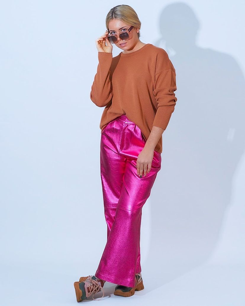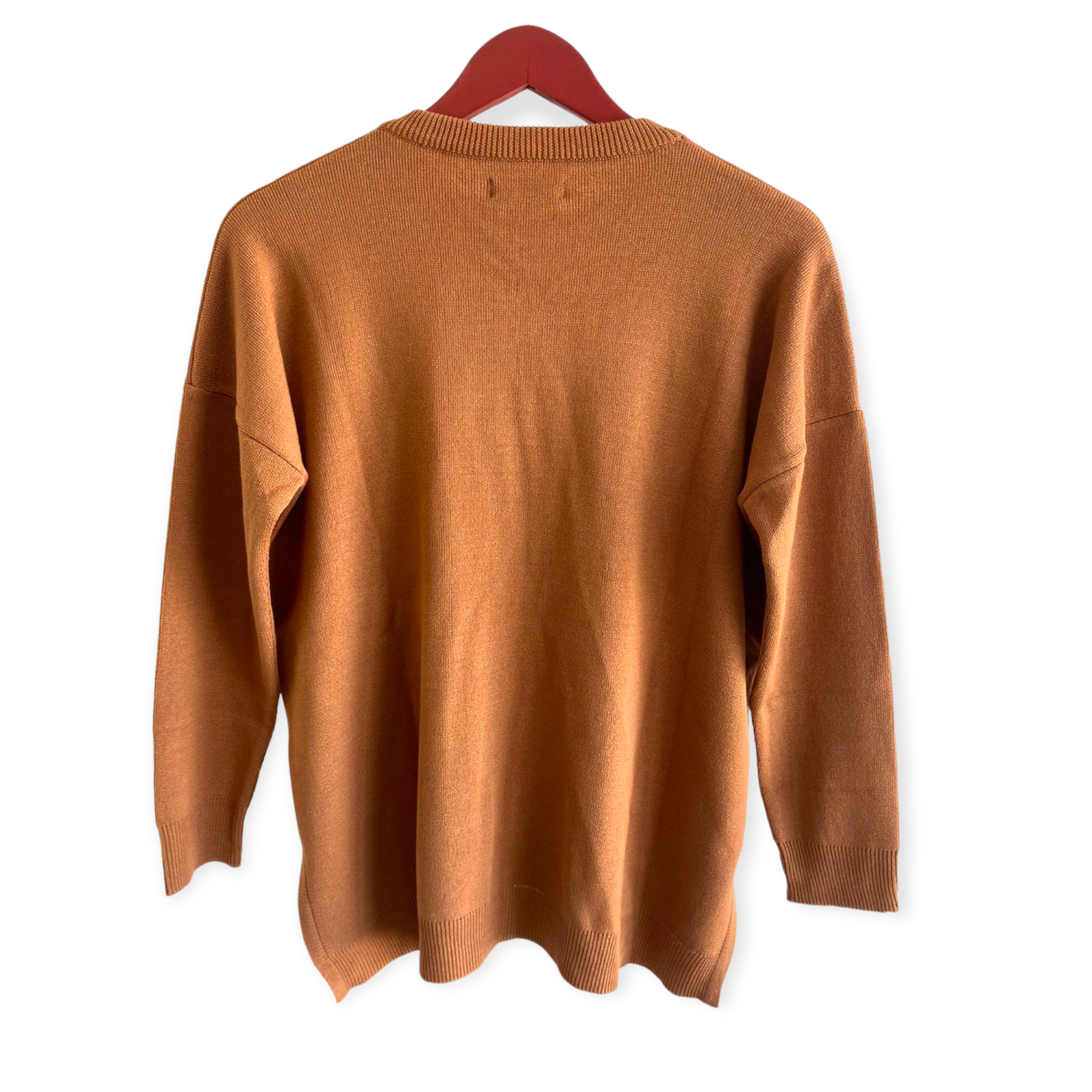 Sweater multitalle con tajos laterales, cuello redondo y largo irregular.