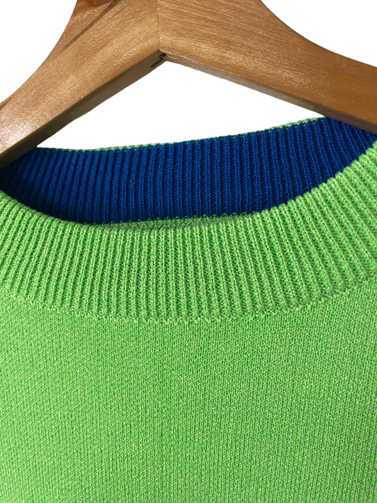 Sweater multitalle con tajos laterales, cuello redondo y largo irregular.